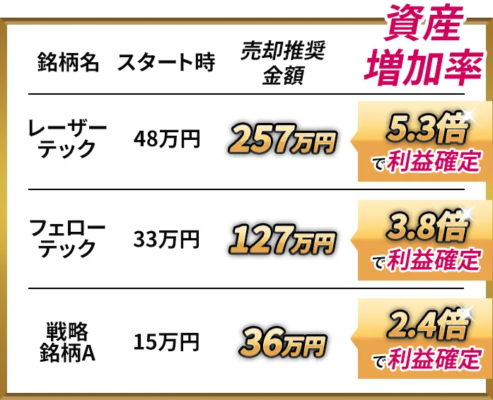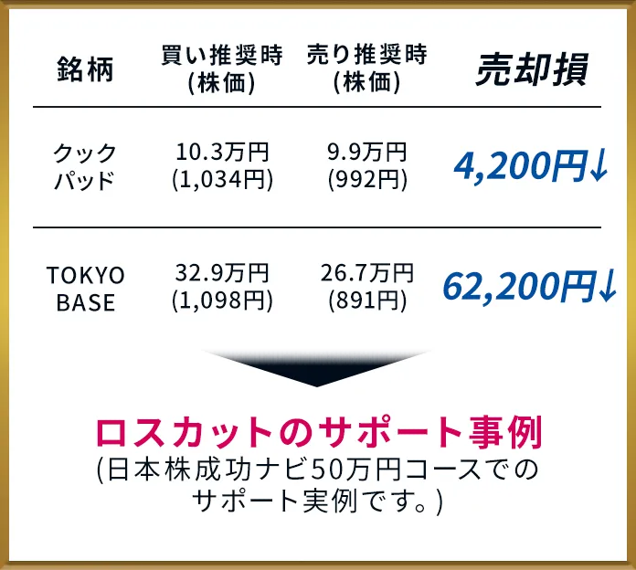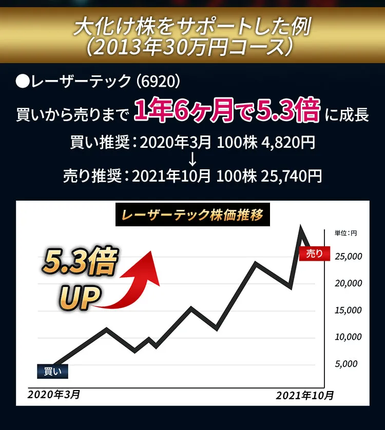 失敗した場合には、迅速な売却で、損失を極力抑えるだけでなく新たな大化け候補銘柄への乗り換えで失敗を成功へと変えていくサポートがされていきます。