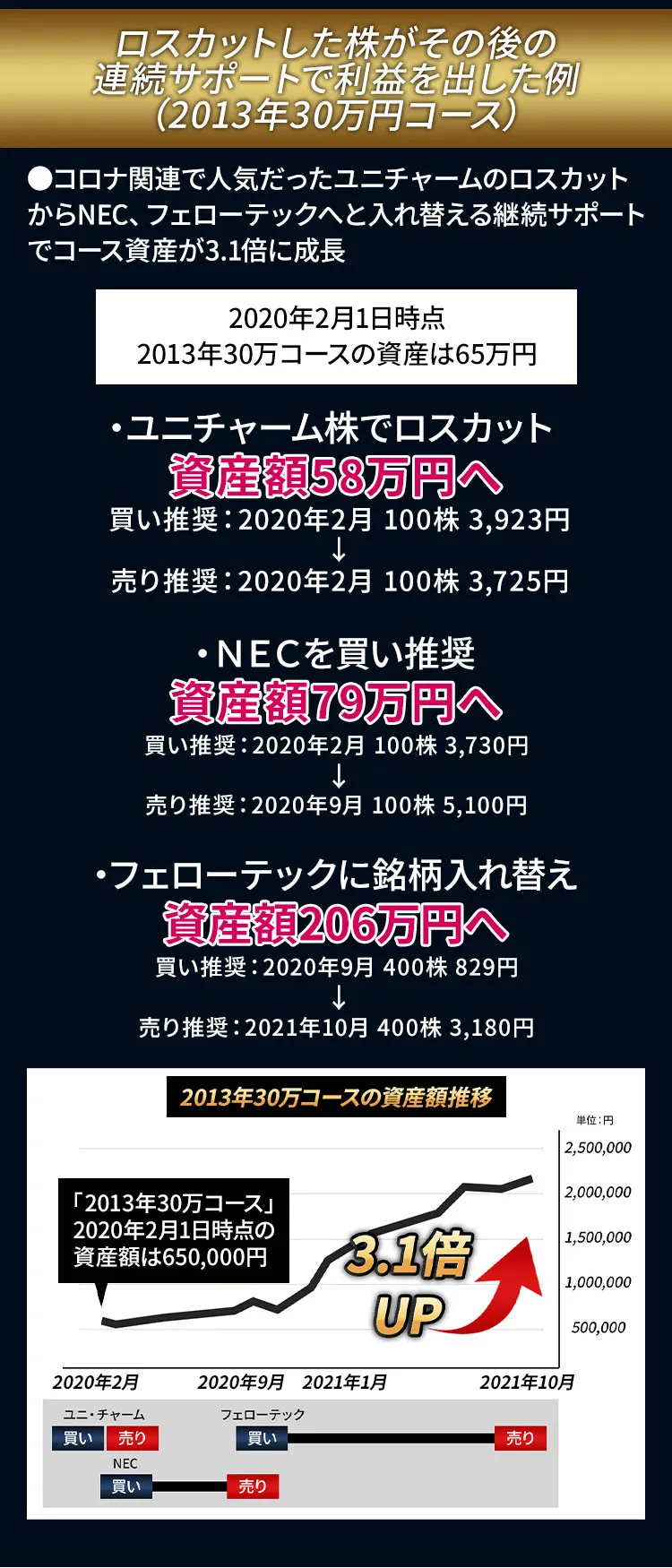 例えば、2020年9月の例で言いますと、弊社の戦略銘柄「フェローテック」はその当時、8万円程度で購入できましたが、1年半後の2021年10月には31万円となっており、あっという間に4倍近くにまで資産を増やすことができました。たった1年年で、これだけ変わっていきます。