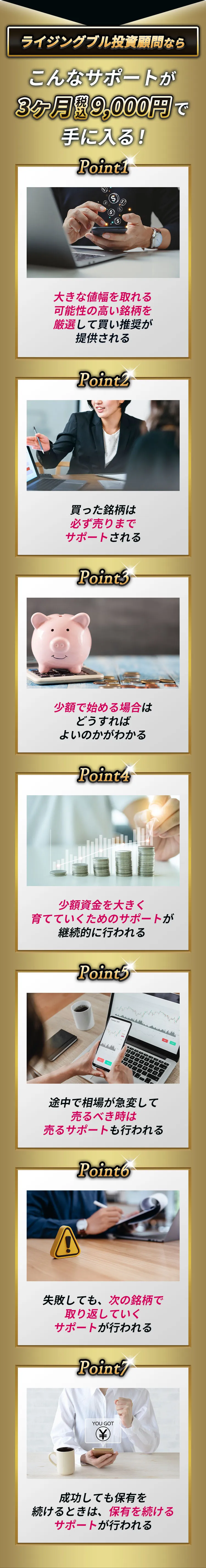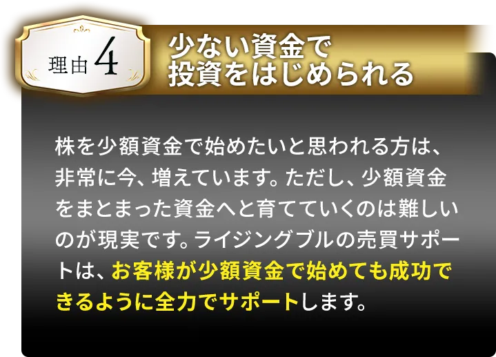 少額の資金であっても、複利で増やしていくサポートが行われ、今後、更に育てていくために、このコンテンツはあります。全くの初心者であっても、弊社の売買サポートと同じように行動すれば、それに近い成果が期待できるのがこのコンテンツです。