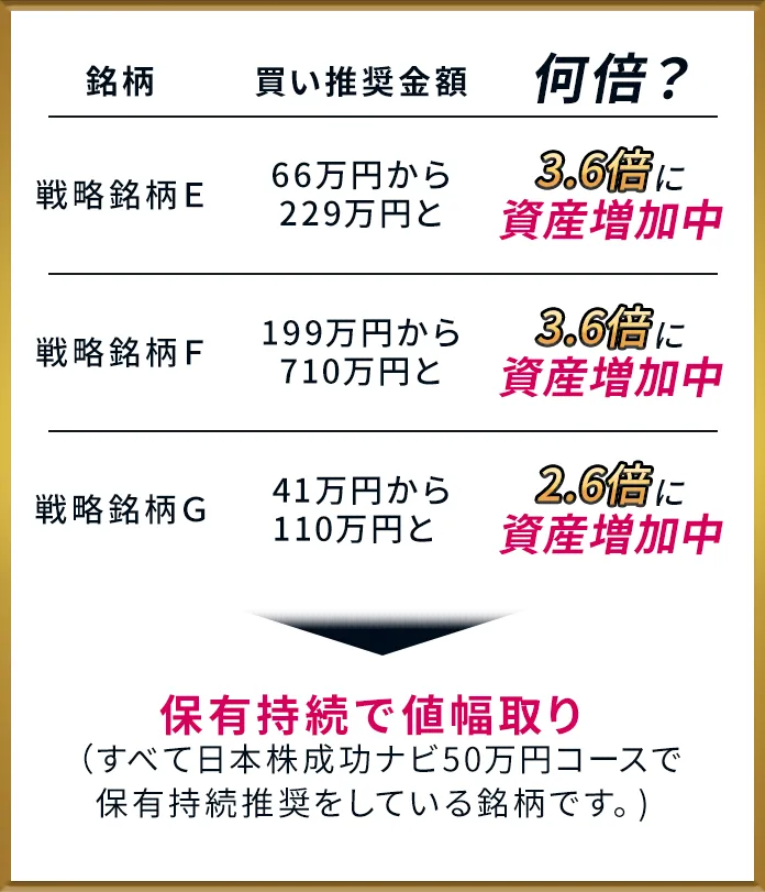 日本株全体はこの数年、紆余曲折がありました。弊社の各種成功ナビはその都度、最適の選択を模索して、財産を守りながら、買いや売却、銘柄入替を繰り返し、売買のサポートをしてきた結果が上表のような成果をもたらしているのです。