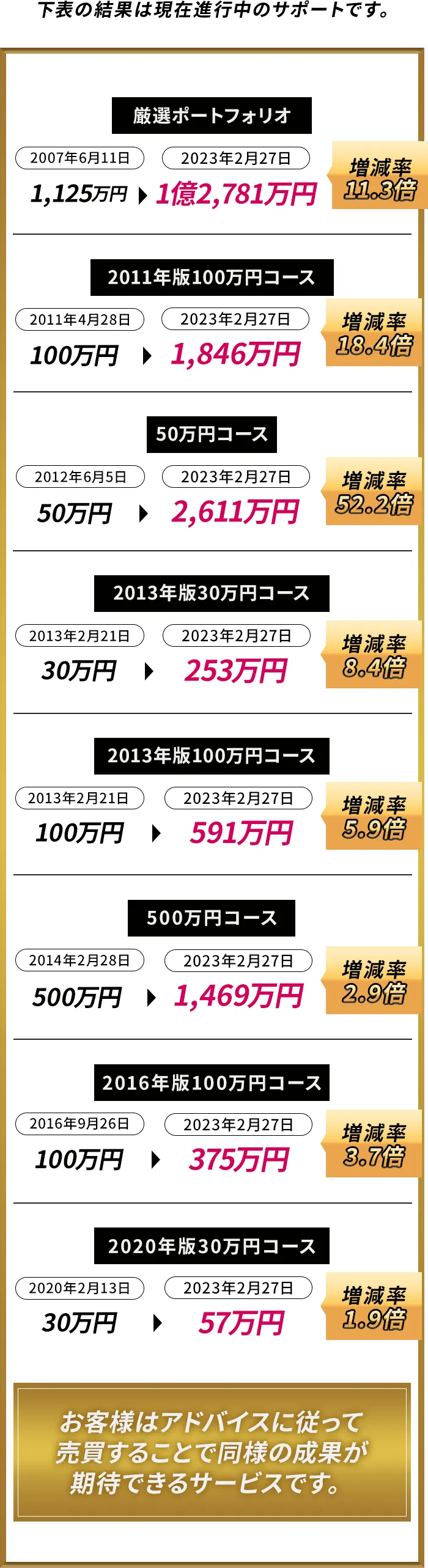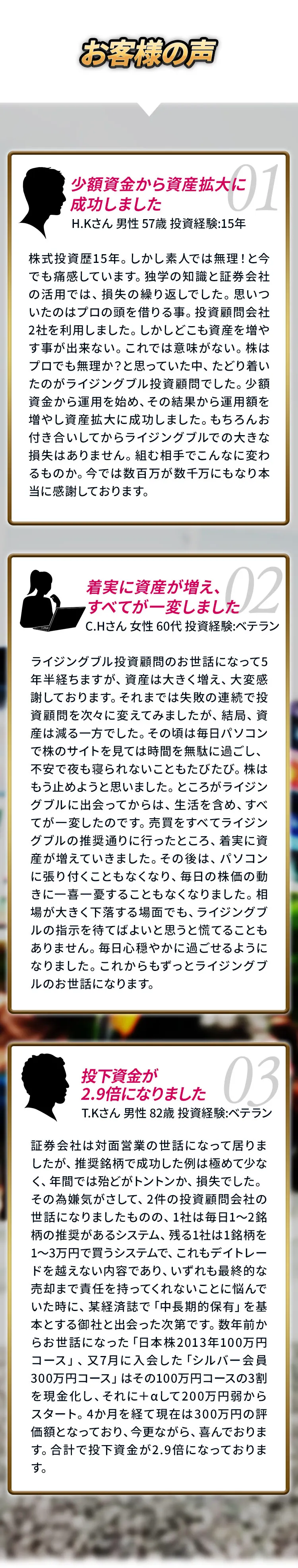 お客様の限られた資金を大きく育てていくためのサポートが継続的に行われていきます。様々な売買のアドバイスを経てはじめて可能となる投資顧問ならではのサービスです。当初の銘柄と今の銘柄では全く異なります。その時々にあった大化け株の厳選から買いから売り、次の大化け株への乗り換えと連続的にサポートしていきます。このような具体的なサポートはまさに人生を一変させるようなインパクトを株はもたらしてくれます。