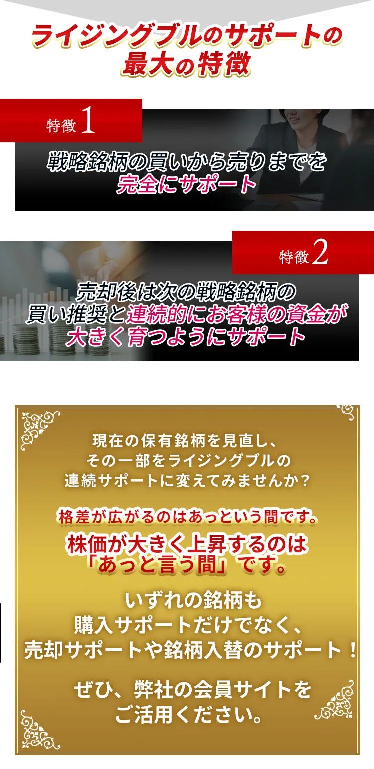 売却した後の、銘柄の入替までサポートしてお客様の大切な資金を形成していくためのサポートが提供されていくのです。