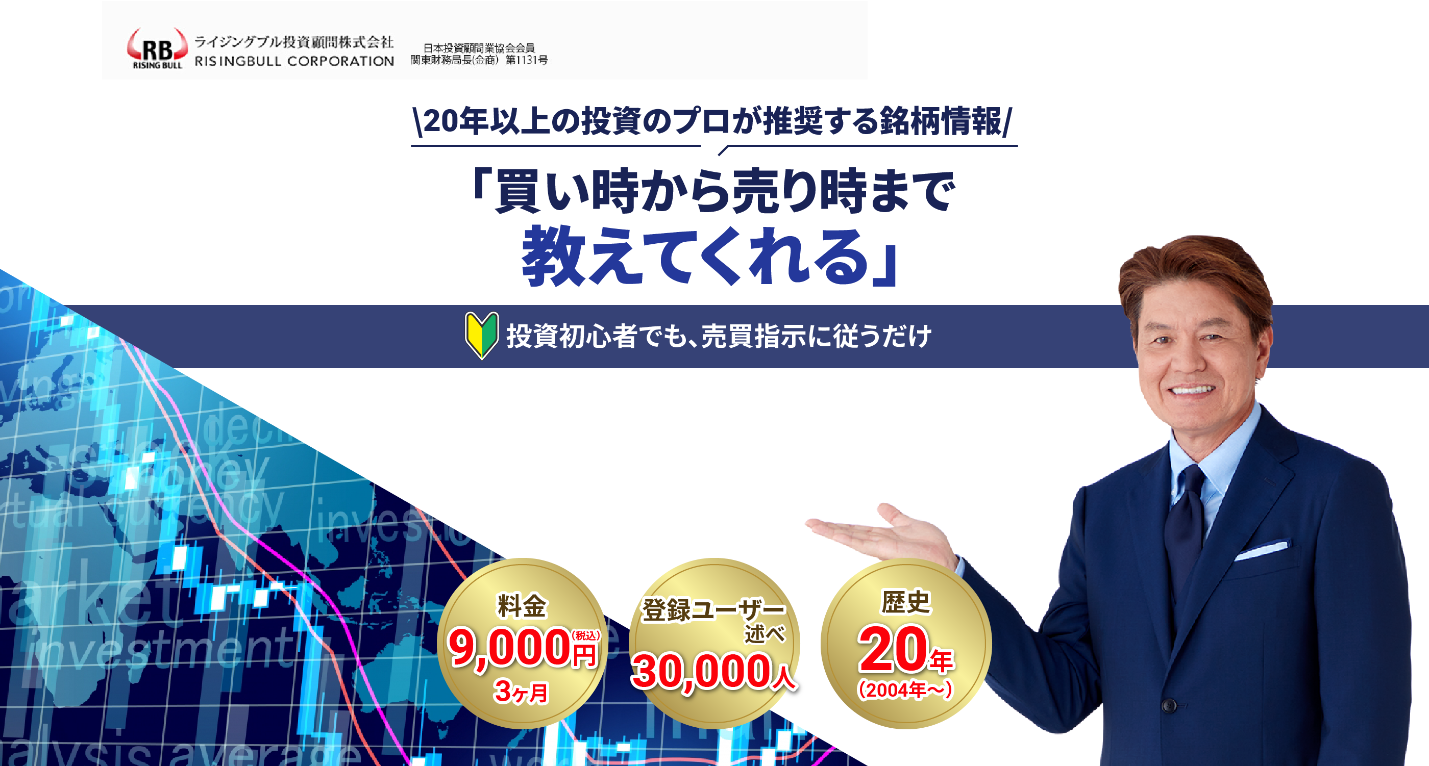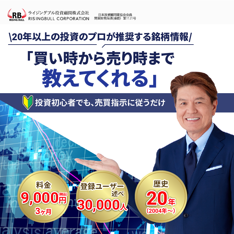 ライジングブルでは、有望株を会員限定で配信。売却や銘柄の入替まで、投資のプロが一貫してサポートします。