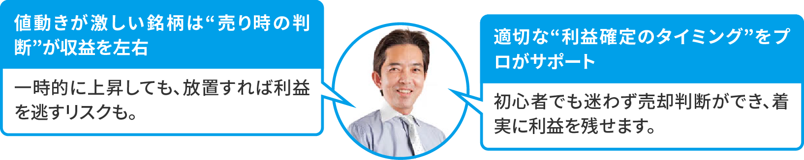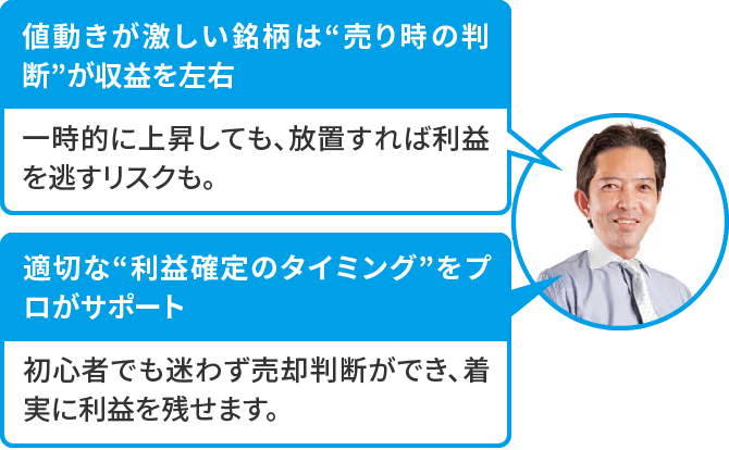 購入だけでなく、相場の状況を見て売却や銘柄入れ替えまでトータルでサポートしています。