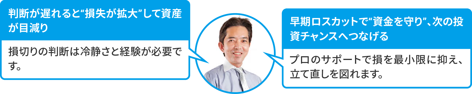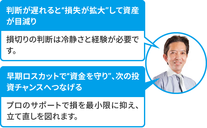 ロスカット,損切りは分かっていても難しいものです。引きずって大きな損を抱えてしまうのはアドバイスがないから。